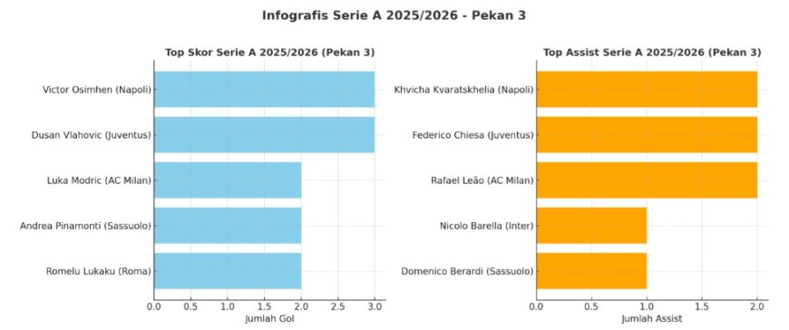 Liga Italia musim 2025/2026 memasuki pekan ketiga dengan persaingan sengit. Juventus menumbangkan Inter 4-3 dalam laga dramatis, sementara Napoli menjaga rekor sempurna usai mengalahkan Fiorentina. AC Milan, Torino, dan Sassuolo juga meraih kemenangan penting. Di klasemen, Napoli dan Juventus sama-sama mengoleksi 9 poin dan memimpin tabel. Dari sisi individu, Osimhen dan Vlahovic tampil tajam dengan tiga gol, sedangkan Kvaratskhelia, Chiesa, dan Leão jadi motor serangan lewat dua assist masing-masing. Serie A kian menarik dengan kejutan dari tim-tim menengah, serta munculnya bintang muda seperti Vasilije Adzic yang mulai mencuri perhatian.