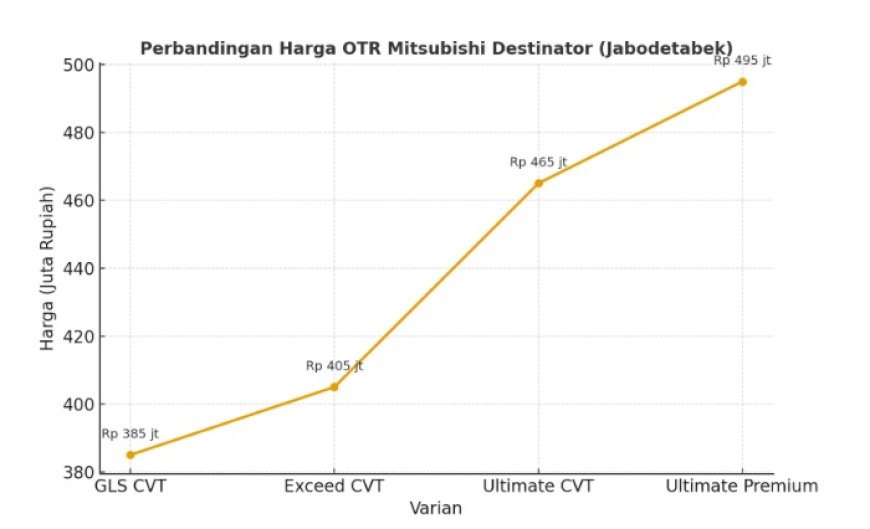 Ini grafik perbandingan harga OTR tiap varian Mitsubishi Destinator. Dengan visual ini, pembaca bisa langsung melihat posisi harga dari varian entry-level (GLS) hingga varian tertinggi (Ultimate Premium).