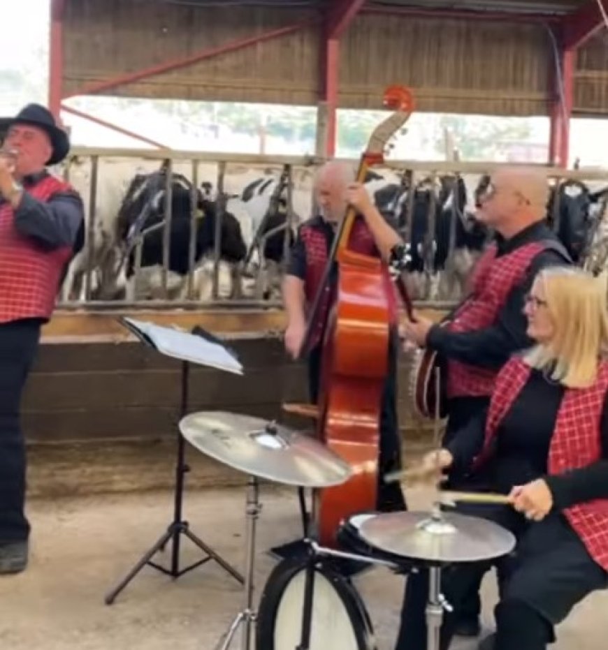 Smithills Open Farm di Bolton, Inggris, menghadirkan Dixie Beats Jazz Band langsung di kandang sapi. Musik jazz membuat sapi lebih rileks dan meningkatkan produksi susu, menciptakan interaksi unik antara musik dan peternakan.